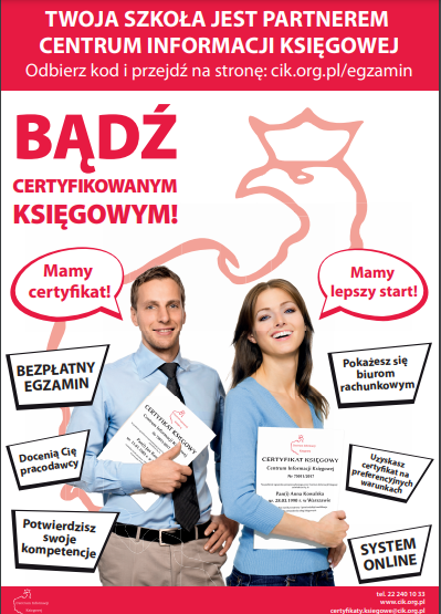 Na podstawie zawartego w ubiegłym roku porozumienia między Zespołem Szkół Ekonomicznych w Skarżysku-Kamiennej i Centrum Informacji Księgowej w Warszawie, nasza szkoła jest ośrodkiem egzaminacyjnym, w którym przeprowadzane są egzaminy na Certyfikat Księgowego. Po zdaniu egzaminu państwowego można ubiegać się o wydanie certyfikatu i automatyczne wpisanie do rejestru Certyfikowanych Księgowych Polskich. Ważne jest również to, że nasi uczniowie i niedawni absolwenci kształcący się w zawodzie technik ekonomista lub technik rachunkowości do egzaminu podchodzą bezpłatnie.