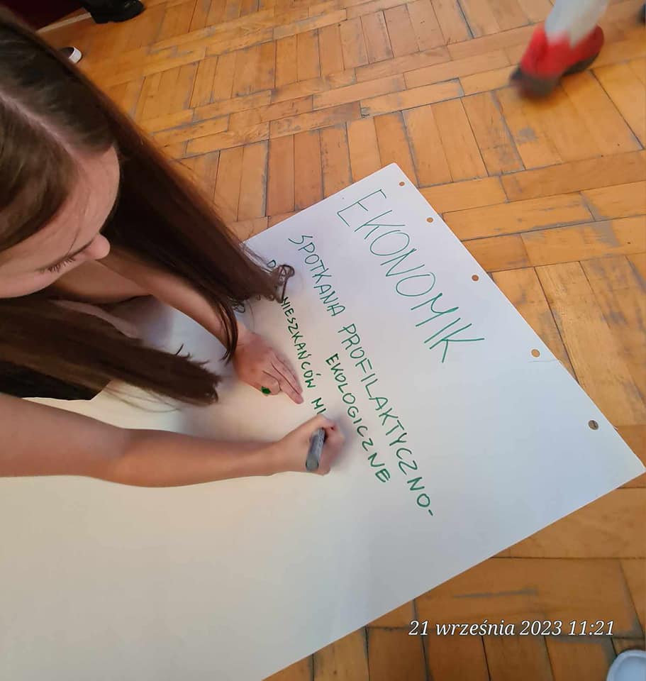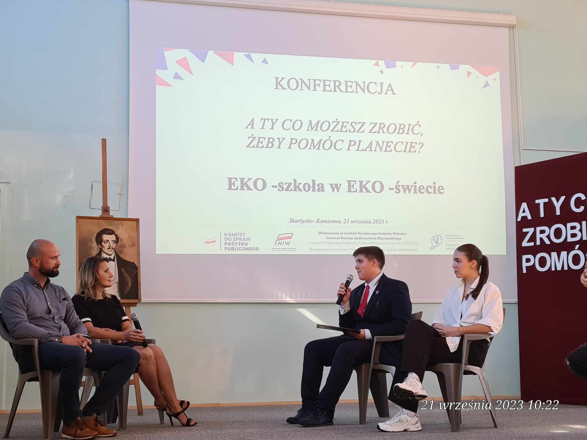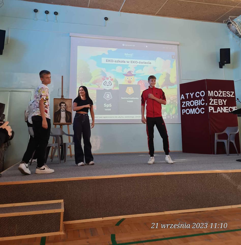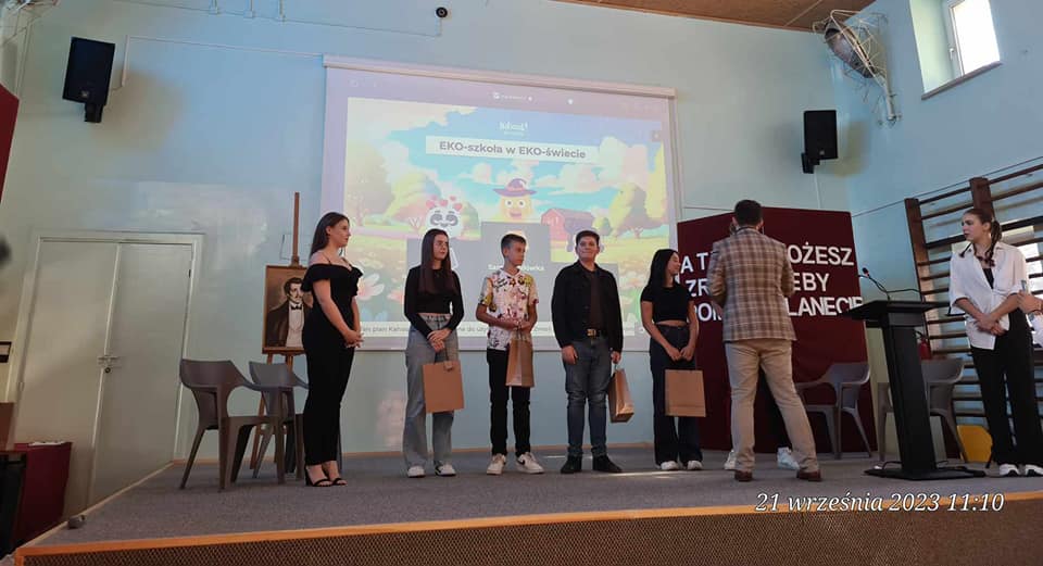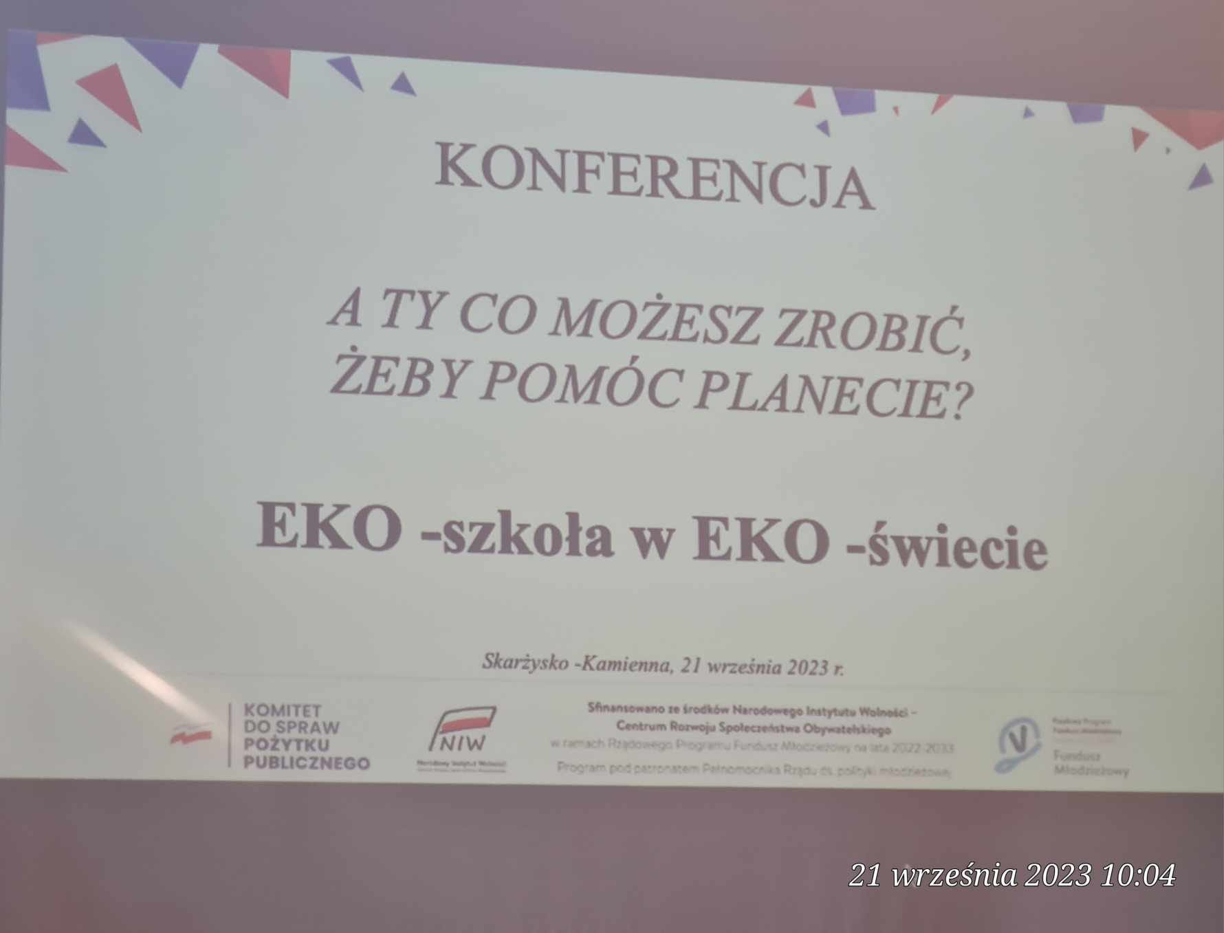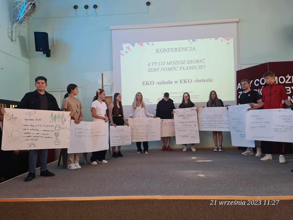 W dniu 21.09.2023 uczniowie klasy 3c uczestniczyli w konferencji „EKO szkoła w EKO – świecie”, która odbyła się w I Liceum Ogólnokształcącym im. Juliusza Słowackiego. Młodzież wysłuchała prelekcji specjalisty weterynarii p. Remigiusza Cichonia, który pomógł zebranym zrozumieć pewne zachowania psów w stosunku do człowieka i środowiska oraz poruszył problem ochrony praw zwierząt. Następnie młodzi ludzie pogłębili swoją wiedzę na temat segregacji śmieci, które stanowią wielkie zagrożenie dla środowiska naturalnego i organizmów. Swoją prezentację na temat „Wpływu człowieka na bioróżnorodność” przedstawił jeden z uczniów I LO w klasy biologiczno-chemicznej. Zebrani uczniowie wzięli także udział w konkursie w formie Kahkoota dotyczącym zagadnień ekologicznych poruszanych na konferencji, w którym uczniowie klasy 3c zajęli 4 miejsce wśród 9 szkół biorących udział spotkaniu. Na koniec młodzież wspólnie opracowała memerendum w sprawie ochrony środowiska, do którego zgłosili swoje postulaty mające poprawić świadomość ekologiczną w naszym mieście. Postulaty te zostaną przekazane władzom naszego miasta. Całe spotkanie uświetniły występy uczennic I LO oraz słodki poczęstunek.