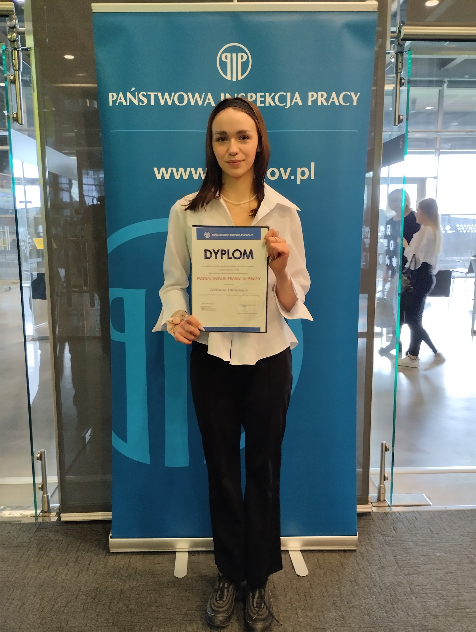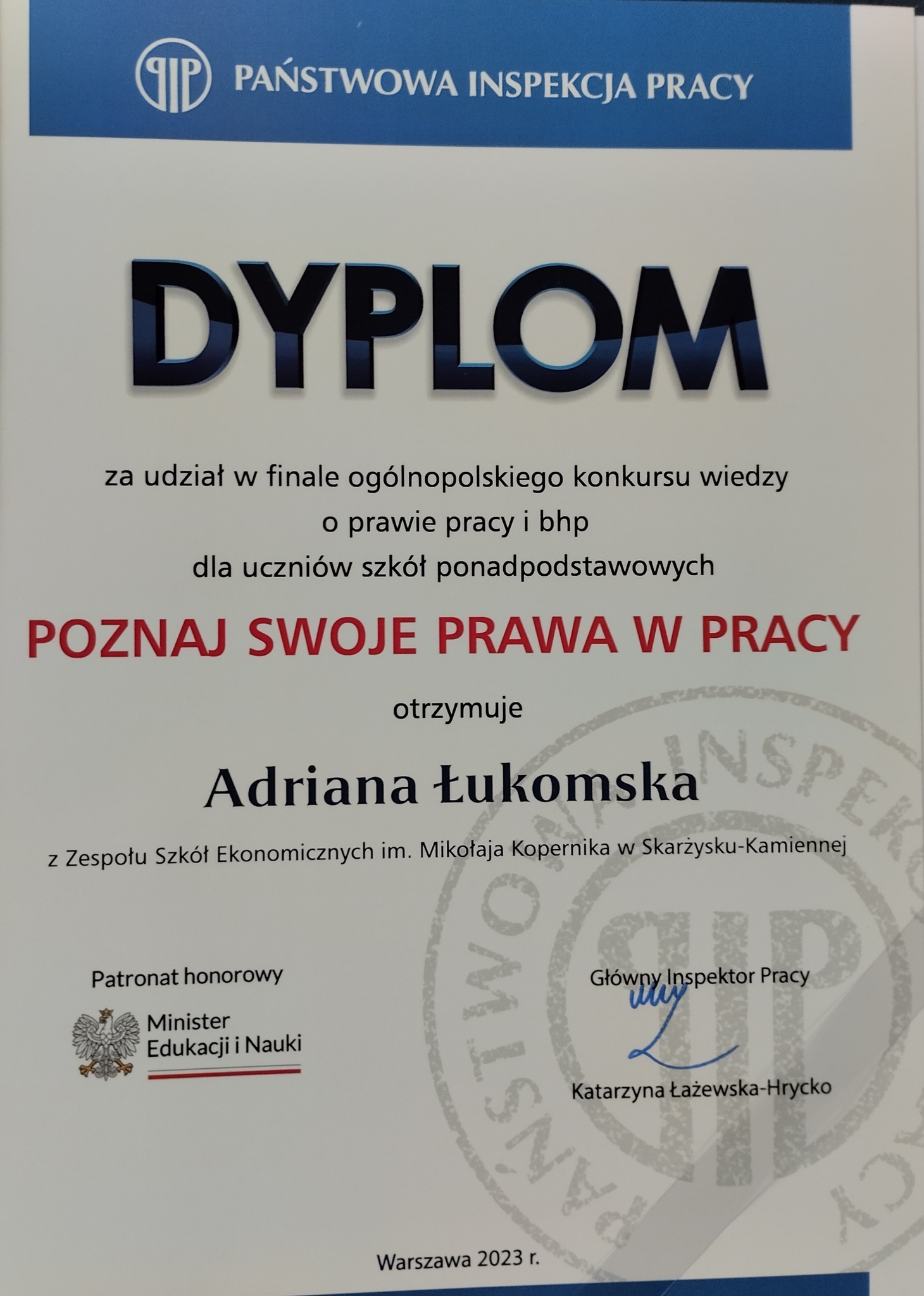 W dniu 18 kwietnia 2023r. w Centrum Nauki Kopernik w Warszawie odbył się finał centralny konkursu "Poznaj swoje prawa w pracy". To już X edycja konkursu z wiedzy o prawie pracy i bhp dla uczniów szkół ponadpodstawowych. Naszą szkołę reprezentowała Adriana Łukomska z klasy 3d. Atrakcją dla młodzieży był pokaz w planetarium, po którym ogłoszono wyniki i wręczono dyplomy.