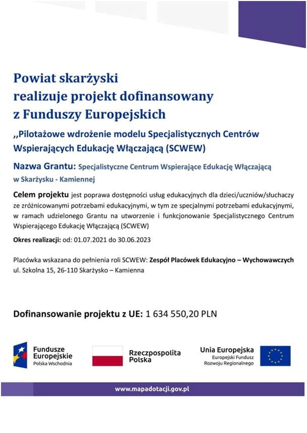 0d września 2021 r. Technikum nr 2 przystąpiło do przedsięwzięcia grantowego: Pilotażowe wdrażanie modelu Specjalistycznych Centrów Wspierających Edukację Włączającą w ramach II Osi priorytetowej Programu Operacyjnego Wiedza Edukacja Wysoka jakość systemu oświaty realizowanego w Zespole Placówek Edukacyjno – Wychowawczych w Skarżysku – Kamiennej. Celem głównym przedsięwzięcia jest poprawa dostępności usług edukacyjnych dla uczniów ze zróżnicowanymi potrzebami edukacyjnymi, w tym ze specjalnymi potrzebami edukacyjnymi, w ramach udzielonego Grantu na utworzenie i funkcjonowanie Specjalistycznego Centrum Wspierającego Edukację Włączającą .