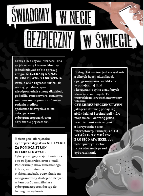 Zadanie konkursowe polegało na realizacji przez uczniów i nauczycieli ZSE jednego z modułów kursu OSE „Bezpieczni w sieci”: „Cyberzagrożenia. Nie wpadnij w sieć przestępcy” oraz przygotowaniu pracy konkursowej – hasła kampanii w mediach społecznościowych wraz z przykładowym postem zawierającym treść i grafikę. Zarówno hasło, jak i post były adresowane do nastoletniej grupy odbiorców i dotyczyły rodzajów cyberzagrożeń oraz sposobów ochrony przed atakami w Internecie. Dodatkowo, praca konkursowa musiała nawiązywać do wiedzy zdobytej w trakcie realizacji kursu.