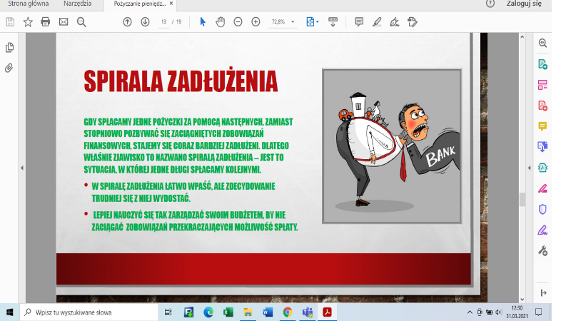 W dniu 31.03.2021 r. w ramach realizacji programu “Złote Szkoły NBP” uczniowie klasy 3b kształcący się w zawodzie technik ekonomista, uczestniczyli w interdyscyplinarnych zajęciach ekonomicznych prowadzonych przez p. Beatę Trojanowską i p. Mariolę Kowalską. Tym samym zrealizowane zostało pierwsze zadanie do wykonania w I edycji programu „Lekcja z ekonomią”.