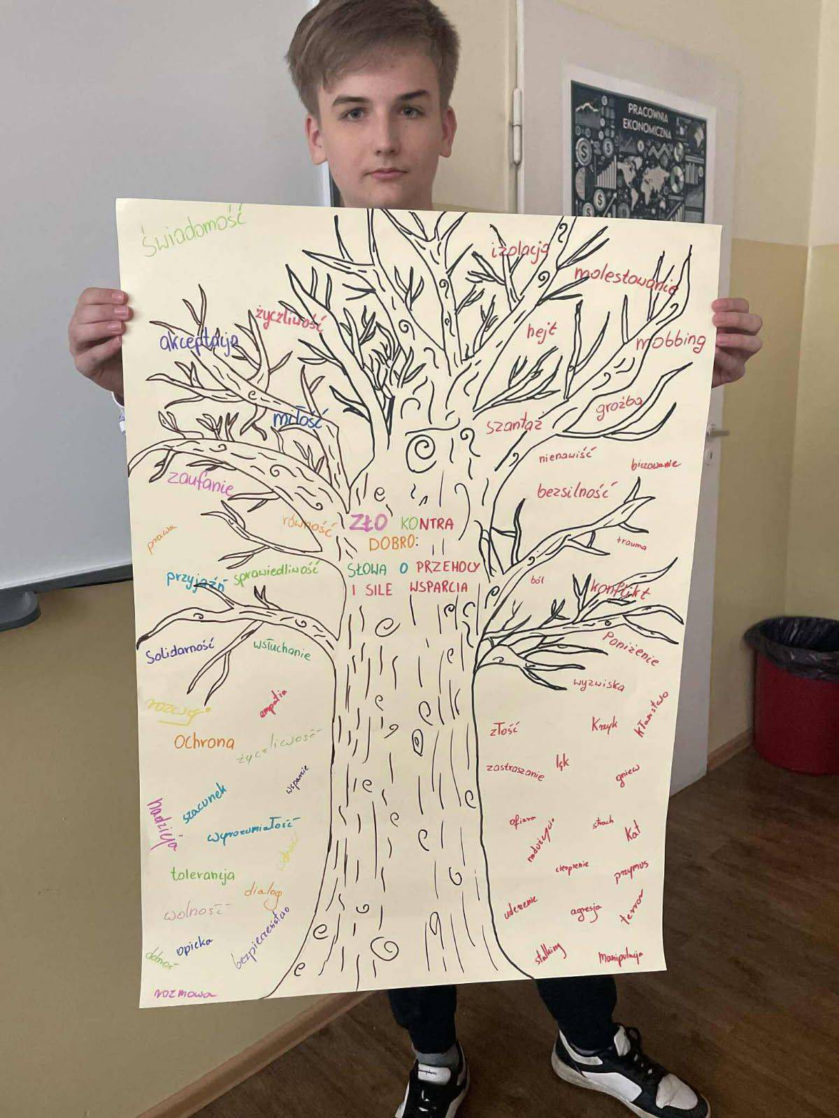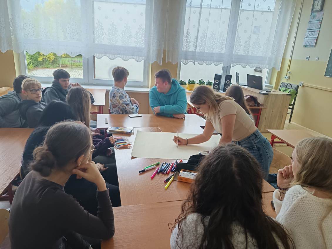 Tydzień Przeciwdziałania Przemocy Rówieśniczej (29.września - 3 października 2025) to inicjatywa Ministerstwa Edukacji Narodowej mająca na celu zwiększenie świadomości na temat różnych form przemocy,promowanie kultury, szacunku i empatii oraz wzmacnianie działań profilaktycznych w szkołach i placówkach oświatowych. W ramach tego tygodnia uczniowie klasy 2a podczas lekcji wychowawczej skupili sie na temacie przemocy w ich środowisku. W trakcie zajęć zapoznali sie z treścią listu Minister Edukacji skierowanej do młodzieży, dowiedzieli sie również jakie są rodzaje przemocy rówieśniczej i jakie emocje i stany psychiczne towarzyszą ofierze takiej przemocy. Budujac pozytywne relacje w grupie wspólnie wykonali plakat przedstawiajacy ich spojrzenie na poruszaną tematykę zajęć.